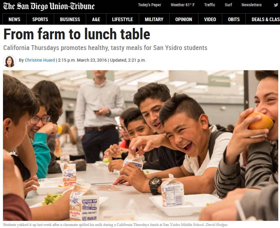 A week later, a March 23rd article in the San Diego Union Tribune featured the farm-to-school efforts of one San Diego County school district participating in California Thursdays, San Ysidro School District, and placed those efforts within the context of regional efforts including the Farm to School Taskforce and citing research from the recent State of Farm to School report.